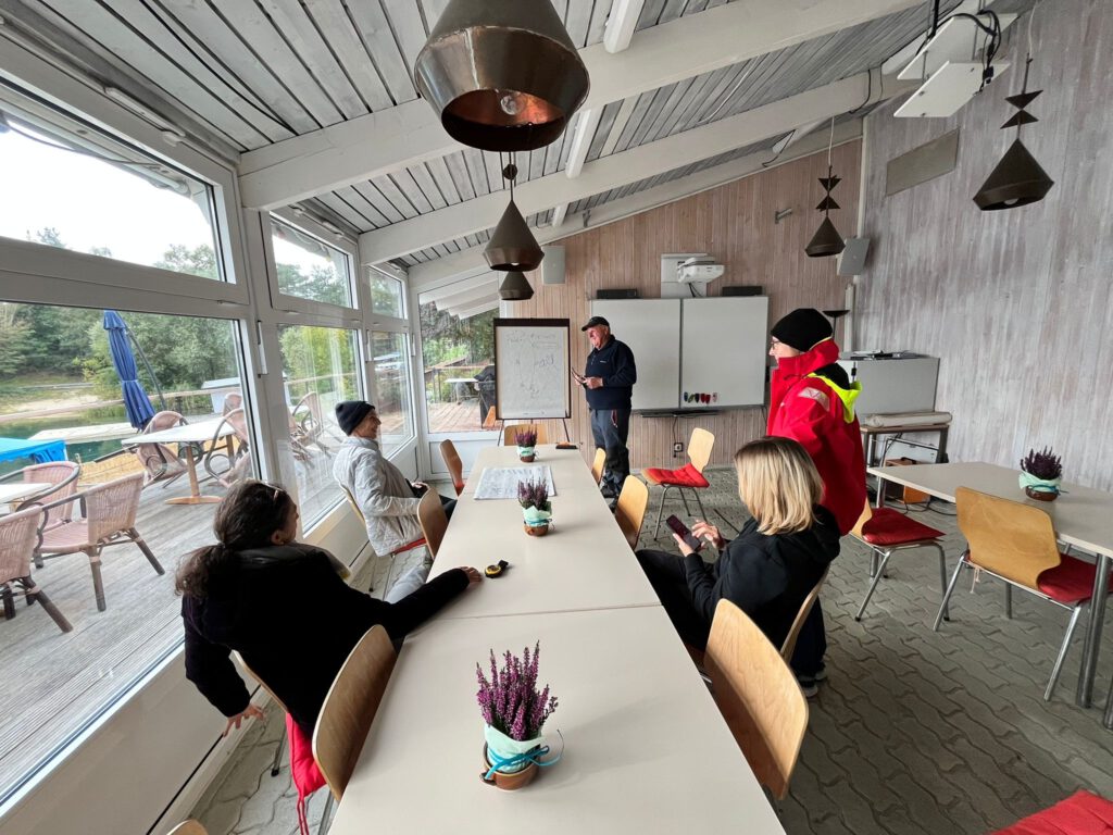 Der Auftakt fand im Clubhaus statt: In einer fundierten Theorieeinheit vermittelte Wolfgang praxisnah die Grundlagen der Manöveroptimierung und Regattataktik. Anhand konkreter Beispiele erklärte er anschaulich, worauf es bei der präzisen Ausführung von Manövern ankommt und wie kleinste Fehler in der Segeleinstellung erhebliche Auswirkungen auf die Geschwindigkeit haben können.