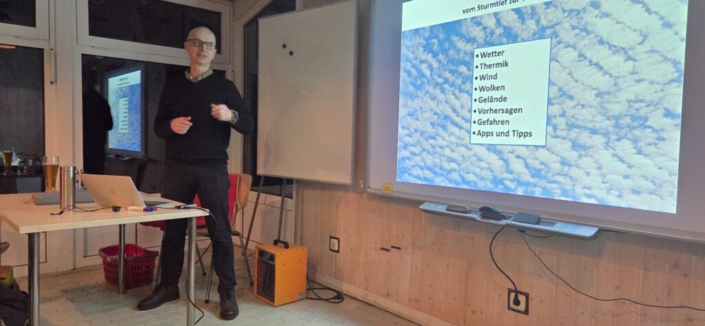 Im Fokus des Abends stand die Erkenntnis, dassWettergeschehen aus dem komplexen Zusammenspielvielfältiger Einflüsse entsteht. Der Vortrag vermittelte fundiertund zugleich anschaulich die grundlegenden Zusammenhängeatmosphärischer Prozesse. Behandelt wurden unter anderemdie Corioliskraft, die Entstehung von Hoch- und Tiefdruckgebieten sowie die typischen Merkmale von Warm- und Kaltfronten. Ergänzend ging es um lokale Wettereffekte, Wolkenbildung und Taupunkt sowie um die Unterscheidunggängiger Wolkenformen. Praxisnahe Hinweise zum sinnvollenEinsatz von Wetter-Apps und zur eigenen Einschätzung von Wetterentwicklungen rundeten die Inhalte ab.