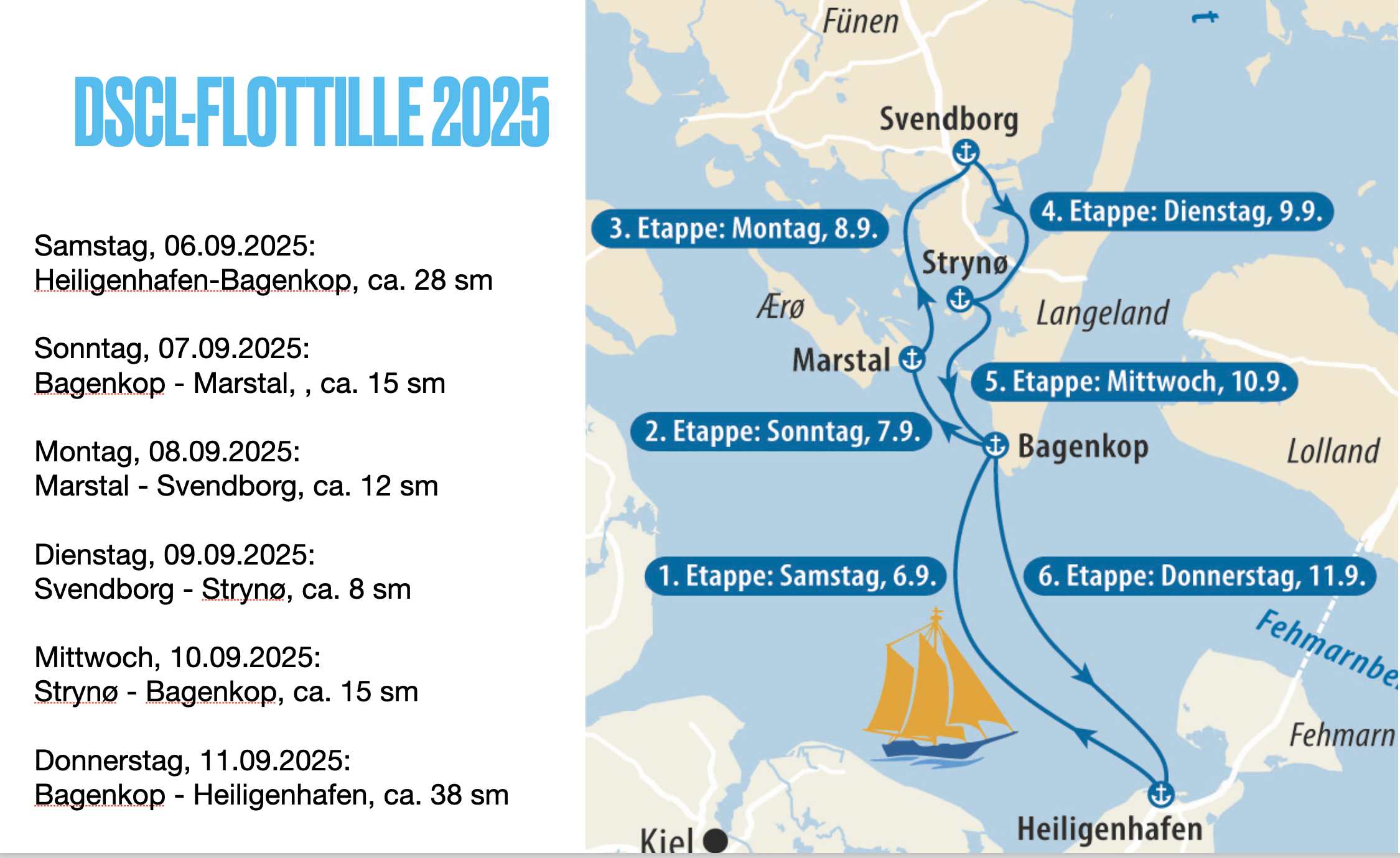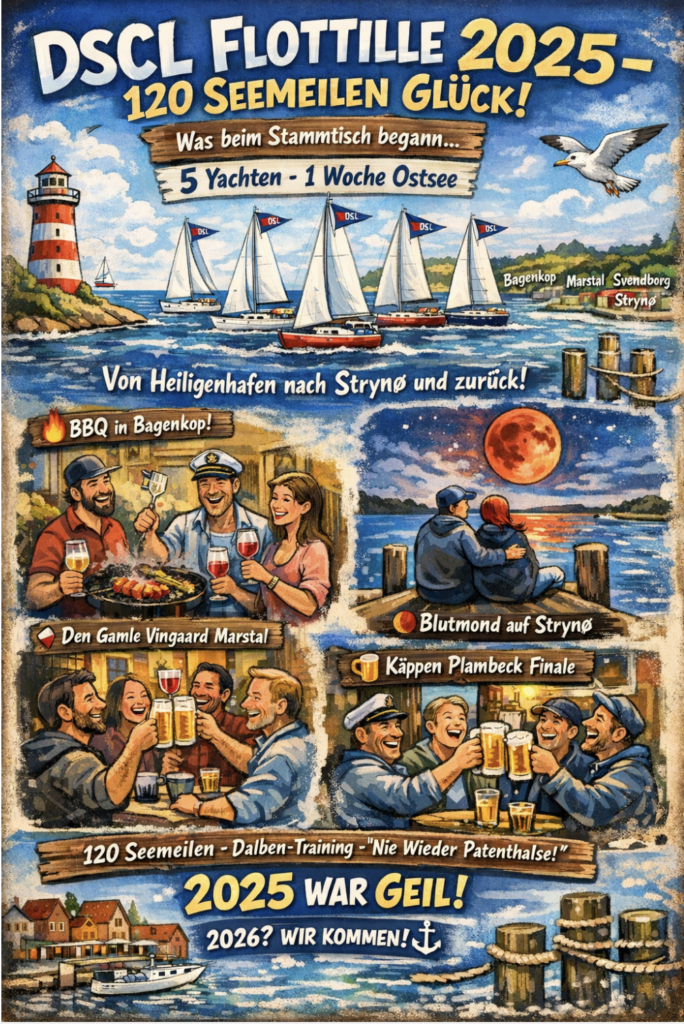 Was bei einem Fahrtenseglerstammtisch im November 2024 begann (Stichwort: Vortrag über eine gebuchte Flottille und die Feststellung: „Das können wir doch selbst!“), wurde im Spätsommer 2025 Realität. Frank übernahm die Organisation und fünf Yachten mit motivierten Crews und DSCL-Wimpel im Wind nahmen Kurs in Richtung dänische Südsee.