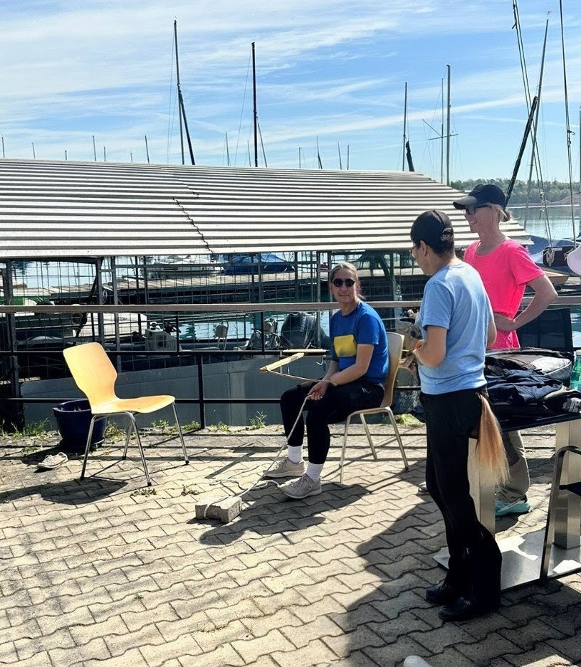 Parallel dazu führte die zweite Gruppe Trockenübungen auf der Terrasse durch. Hierfür kam eine eigens konstruierte Übungspinne aus Bambusstäben, Holz und Leine zum Einsatz, ergänzt durch zwei Stühle zur Darstellung der Bootsposition sowie eine fixierte Schot. Dadurch konnten die Manöver Wende und Halse anschaulich und ohne äußere Einflüsse trainiert werden. Besonders hervorgehoben wurde die Möglichkeit, sich gezielt auf Kommandos und Bewegungsabläufe zu konzentrieren.